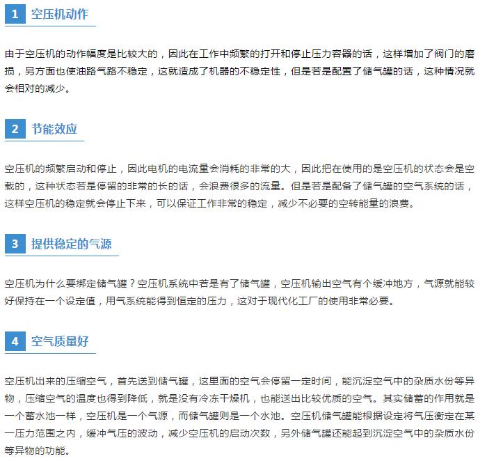 最近關(guān)于空壓機(jī)儲氣罐接到了很多網(wǎng)友的提問,下面就給空壓機(jī)使用者總結(jié)一下儲氣罐的潛在作用。![]()