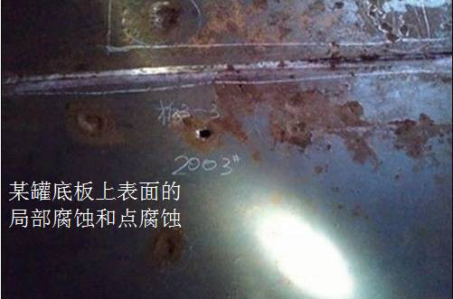 儲罐底板的介質(zhì)側(cè)一般腐蝕的會(huì)比壁板更加嚴(yán)重,有時(shí)甚至?xí)g穿孔而出現(xiàn)泄漏現(xiàn)象。這些腐蝕主要源于灌內(nèi)的沉積水,沉積水中的硫化物、氯化物、氧等物質(zhì)會(huì)與金屬發(fā)生反應(yīng),造成的電化學(xué)腐蝕。